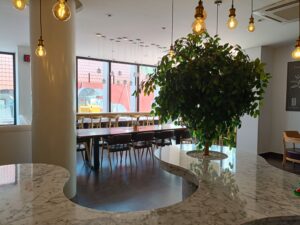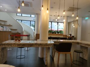 BKK1らしい洗練された街並みに溶け込む外観で、店内は明るく開放的。