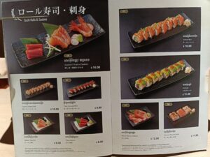 ロール寿司や刺身、日本ではない特別メニューがあります。