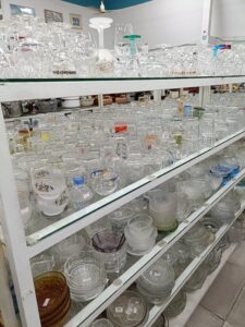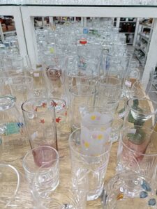 サクラリサイクルショップでまず目を引くのが、日本製のグラス・茶碗・どんぶり・保存容器。